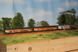 Nun kann es losgehen. Schritt 1 ist das ausbleichen des Lackes, dafür nehme ich ein helles Grün gemischt mit Weiß was leicht mit Wasser verdünnt wird. Diese wird dann auf die grüne Fläche die ausgebleicht werden soll aufgebracht (mit einem normalen Pinsel) und sofort mit dem Makeup Pinsel in horizontaler und vertikaler Richtung gebürstet (dies dient dazu Pinselstriche und Harte Kanten zu vermeiden! probiert das gerne auf anderen Flächen oder Güterwagen vorher aus ) verwischt bzw. drüber gepinselt bis die Feuchtigkeit weg ist. Farbe die auf Fenster und beschriftung kommt kann mit einem nassen Zahnstocher (weiches Holzstückchen) wieder entfernt werden. Gleiches gilt für eventuelle Flicken, auf diesen wird der gebleichte Lack wieder entfernt.