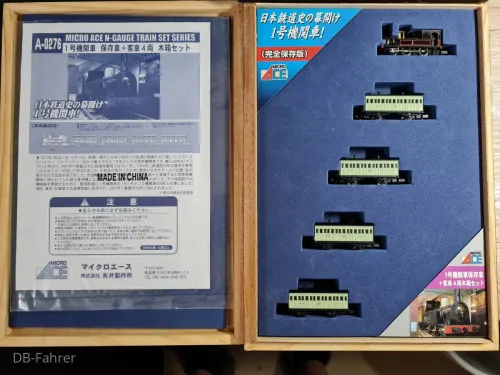 Warum das Set 2003 extra in 1:120 gefertig wurde und nicht wie üblich in 1:150 für die Kapspurmodelle in Japan kann ich leider nicht sagen. Eine schöne aufmachung ist die Holzschatulle, welche außen versiegelt ist, als Verpackung (ist bei MicroAce bei wenigen Speziellen Sets der Fall gewesen, z.B. Rekordzügen usw.). Das Modell selbst ist angetrieben und fährt auch so echt gut.