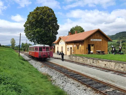 Dort steigen wir vom "Straßenomnibus" auf den "Schienenbus" um und fahren mit dem "Hurvinek" M 131 nach Krimov in die dortige Remise des Vereins LOKO-MOTIV.