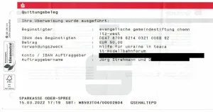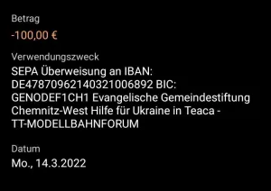 Verwendungszweck: Hilfe für Ukraine in Teaca - TT-MODELLBAHNFORUM dazu schreiben, das dient der Zuordnung da diese Aktion übers TT-Modellbahnforum läuft.