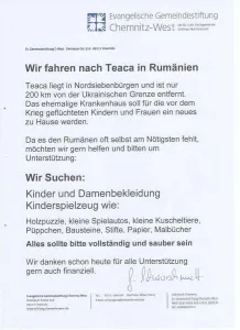 Ich habe mit einem alten und guten Freund aus Chemnitz telefoniert und er hat mir mitgeteilt, dass seine Gemeinde über die Evangelische Gemeindestiftung Chemnitz - West eine Partnergemeinde in Rumänien (Teaca) mit Sachspenden und Finanziell unterstütz.