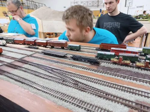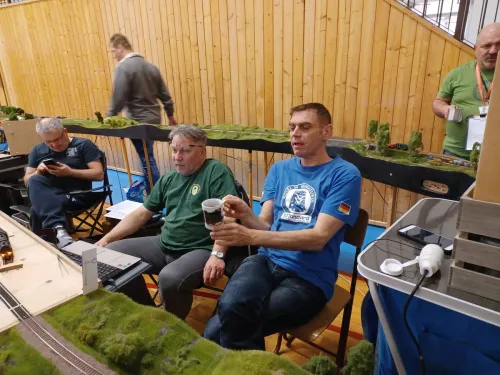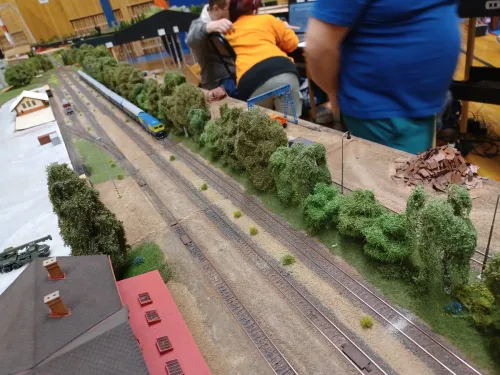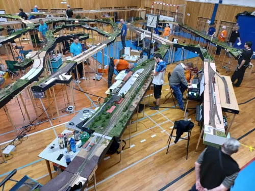 Der Herr rechts im Bild hat die flexiblen Gleisübergänge und das Zwangsgleis gelötet.