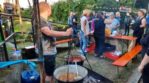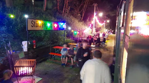 Da ein langer Abend bevorsteht, fällt die 17:00 Uhr Fahrt aus. So bleibt genügend Zeit um die Vorräte an Kohle und Wasser zu ergänzen und die Lok zu restaurieren. Der Sonderzug zum Bahnsteigfest fährt um 19:00 Uhr am Bahnhof Schönheide ab. In Stützengrün stehen bereits Tische und Bänke direkt auf dem Bahnsteig, dazu gibt es Lagerfeuerromantik mit Stockbrot, Livemusik, Imbiss und Getränken.