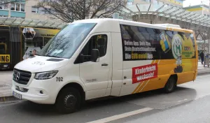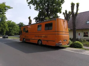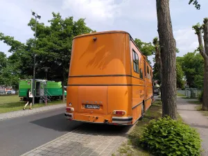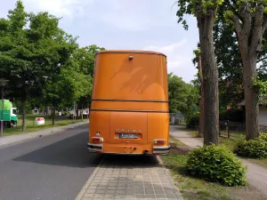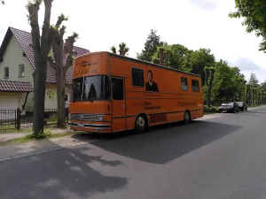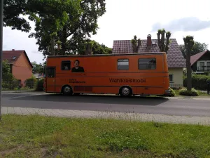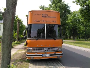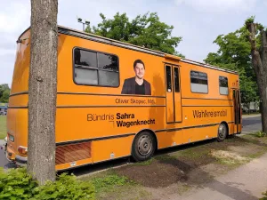 Wehe, wenn das jemand als Einladung zu einer politischen Diskussion missversteht, es geht lediglich um das sehr interessante, gut erhaltene Fahrzeug. UKR meint, dass es sich dabei um einen ehemaligen Röntgenbus einer Berufsgenossenschaft handele. Jetzt ist der Kässbohrer als Wahlkampfmobil unterwegs: