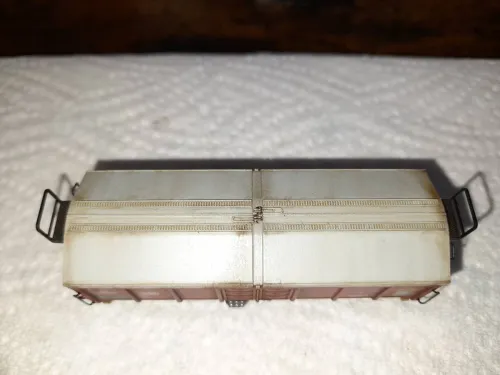 Folgende Arbeiten sind geplant: Tausch der Plastikachsen gegen zeitgemäße Radsätze, Umbau auf feststehende Pufferbohle, farbliche Anpassung der Inneneinrichtung und Bestückung mit Fahrgästen, Umrüstung auf Kurzkupplungskulisse mit neuen Kupplungen, Patinierung gemäß Betriebszustand Anfang der 80er Jahre. Hier noch 2:foto:vom derzeitigen Zustand. Das Endergebnis wird dann zu gegebener Zeit in Wort und Bild hier vorgestellt:hand:.ZerlegungDas Teil ist wirklich noch von Prefo:).