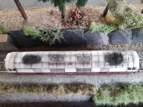 da mein Dosto-Projekt zur Zeit auf Eis liegt (warten auf Ersatzteile), konnte ich mich wieder verstärkt anderen Baustellen widmen;). Also hab ich mir mal meine ROCO-110er vorgenommen und sie etwas erbleichen lassen:hä:. Doch damit nicht genug, im Netz fand ich ein Bild einer ziemlich "abgeranzten" 112er:lupe: und machte mich flugs daran, diesen Zustand auch meiner Maschine angedeihen zu lassen:48:. Nach 3 Tagen (inclusive Farbtrocknungszeit) war es vollbracht:gut:. Verwendet wurden die üblichen Washes und Pigmente, sowie matter Klarlack zum versiegeln. Ich denke, so kann die Lok in den Einsatz gehen, wobei, die Mitarbeiter der Einsatzstelle Bernroda werden wohl ob des Pflegezustandes nicht gerade begeistert sein:nee:. Hier nun paar:foto:...