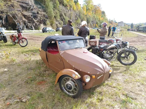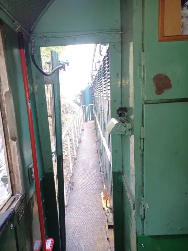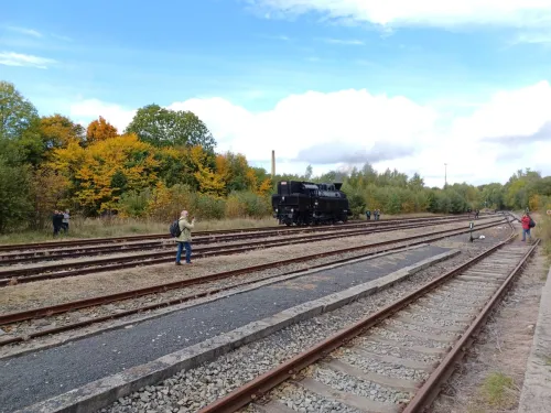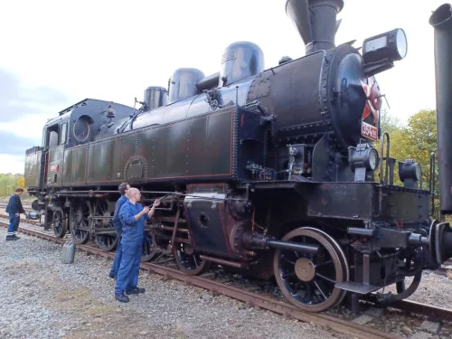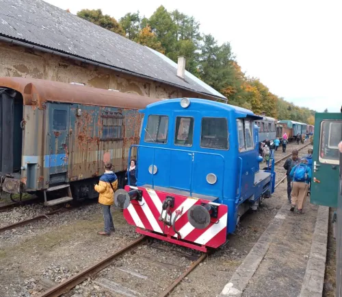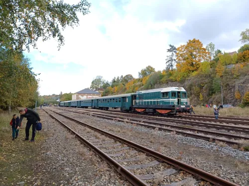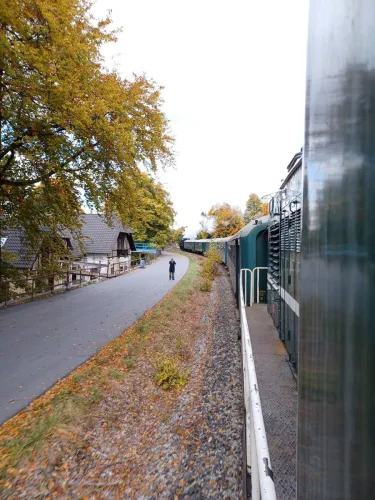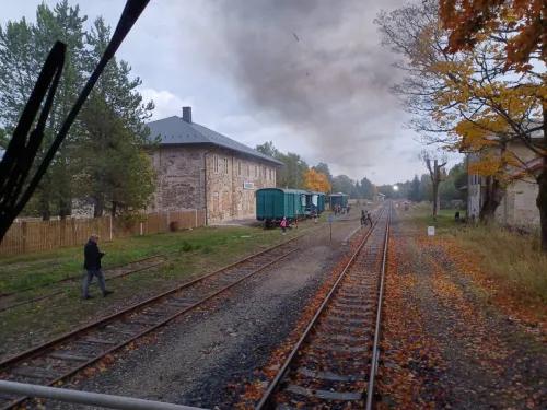 Aufgrund der Auslastung des Zuges und des Wetters (Tau, Nebel, Laub, feuchte unbefahrene Gleise und Laub) und seit 03.10. Kein Verkehr mehr auf der Strecke, gestaltete sich die Bergfahrt äußerst schwierig und der Zug blieb mehrmals in der starken Steigung hängen, was aber vom Lok Personal bravurös gemeistert wurde und wir nur mit +30 in Krimov ankamen.