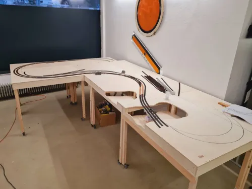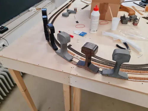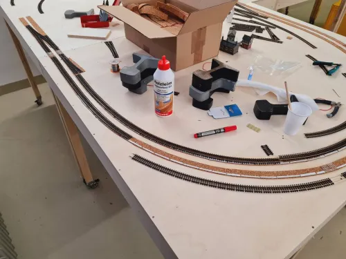 Mal sehen was ich heute Abend alles schaff, in meiner Mittagspause habe ich schon die Streifen für die Kurvenüberhöhung aufgegklebt und ein paar Streifen mehr Kork