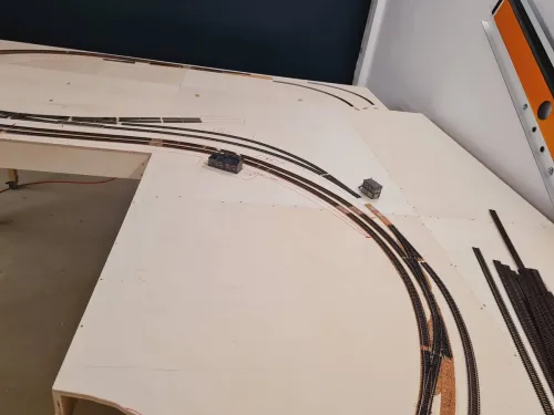 Die ersten Peco Gleise liegen und auch die Tillig Weichenverbindung im leichten Bogen liegt nun. Denke bis zum Wochenende liegen die Gleise der Hauptstrecke zum Fiddle Yard, dann gehts los mit dem Bahnhofsgleisen.