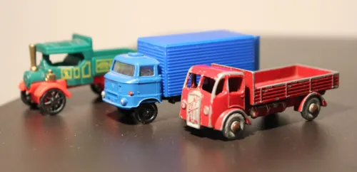 Dann ist mir aufgefallen, dass einige ältere Matchbox-LKW auch ziemlich genau TT sind. Ich hatte sie mir erst einmal zugelegt, würde gern mal ein kleines Diorama machen, wenn Hornby die Pannier, die in Textform mal vorangekündigt wurde, tatsächlich bringt. Dazu sollen die aber neue Farbe und verglaste Fenster kriegen.