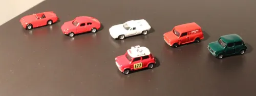Das macht immer wieder Spaß, sich deine englische Anlage anzuschauen. Zum Thema Autos dafür: Den Gabor-Mini bekommt man selten. Was relativ häufig zu bekommen ist, sind Metallmodelle aus japanischer Konstruktion. Da gibt es eine unglaubliche Bandbreite an Fahrzeugen, die aber keinen festen Maßstab haben. Gerade größere Fahrzeuge sind eigentlich immer für TT zu klein. Aber ein paar britische Winzlinge sind ziemlich genau oder mindestens fast 1:120, nämlich verschiedene Mini, der Mini Marcos, der Austin Healey Sprite und der Lotus Europa: