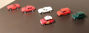 Das macht immer wieder Spaß, sich deine englische Anlage anzuschauen. Zum Thema Autos dafür: Den Gabor-Mini bekommt man selten. Was relativ häufig zu bekommen ist, sind Metallmodelle aus japanischer Konstruktion. Da gibt es eine unglaubliche Bandbreite an Fahrzeugen, die aber keinen festen Maßstab haben. Gerade größere Fahrzeuge sind eigentlich immer für TT zu klein. Aber ein paar britische Winzlinge sind ziemlich genau oder mindestens fast 1:120, nämlich verschiedene Mini, der Mini Marcos, der Austin Healey Sprite und der Lotus Europa: