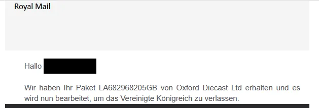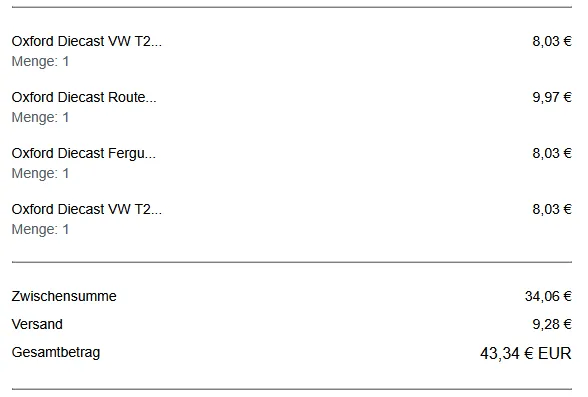 Das ist das, was ich an der Kasse bezahlt habe. Ich war jetzt zu faul, mal nachzuschauen, was britische Kunden zahlen, aber ich habe den Eindruck, dass Oxford die britische Mehrwertsteuer garnicht erst erhebt. Dazu kamen dann 19 Prozent Einfuhr-Umsatzsteuer (die auch auf die Versandkosten erhoben werden). Das sind 8.23 Euro. Dazu erhebt DHL pauschal 7,50 Euro Gebühr für das Eintreiben der Einfuhrumsatzsteuer. (Nebenbei: Das finde ich blöd, weil damit kein Gewinn an Komfort einhergeht. Die haben keine Kartenlesegeräte und kein Wechselgeld auf den Autos. Die informieren einen auch nicht vorher, dass sie kommen, um Zoll einzusammeln und wieviel das sein wird. Das hat bisher fast immer damit geendet, dass sie es wieder mitgenommen haben und ich es dann auf der Post abholen musste. Die 7,50 Euro für den unglaublich tollen "Service" zahlt man trotzdem, dabei wäre das Hauptzollamt Frankfurt (Oder) auch kaum weiter weg, und da würde ich mir das Päckchen liebend gern selbst abholen.) In Summe komme ich somit auf nicht ganz 15 Euro pro Auto, und das ist für ein Fertigmodell dieser Qualität nicht viel. Wenn man mehr Autos nimmt, sinkt der Versandanteil pro Auto, die EUSt auf den Versand pro Auto und die Umlage für DHL pro Auto. Sparen kann man bei der Sammelbestellung auch nur bei den pauschalen Kosten, d.h., der Versand wird ein bisschen billiger, und man teilt sich die DHL-Gebühr. Dafür muss dann jemand wieder Päckchen packen, und es werden noch einmal Kosten für Verpackung und Porto fällig.