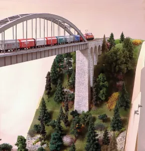 seit nunmehr 5 Jahren baue ich am Modul "Trisannabrücke". Das Vorbild liegt etwa bei Kilometer 80 auf der Arlbergbahn in Österreich. Ich habe mir diese Brücke ausgesucht, weil ich die, seitdem ich sie zum ersten Mal gesehen habe, absolut elegant und beeindruckend finde. Das Modell ist nicht verkürzt. Ebenso wurde die Originalhöhe über Talgrund exakt wiedergegeben.