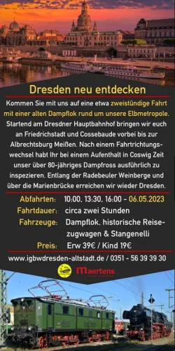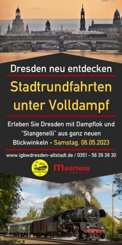 Am 06. Mai finden Rundfahrten um Dresden und bis Meißen statt, eingesetzt werden Dampflok und Stangenelli.