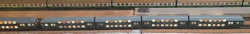 Ja, ist hell geworden. Ich müsste eine Spannungsregelung einbauen, um das realistischer zu gestalten. Aber erst mal lass ich das so. Ich weiß auch, das die Führerstände nicht beleuchtet sind. Beim Arnold Zug ist das auch so. In den BTTB Zug werde ich noch eine Trennwand einbauen. Hatte erst mal keine Lust dazu. Die Trennung zwischen den Wagen habe ich mit Pappe realisiert. Darauf sind dann auch Dioden und Wiederstände geklebt. Lichtplatinen habe ich nicht verwendet, die LED habe ich an die Decken geklebt und auch dort verdrahtet. Trennwände an den Faltenbälgen will ich bei den BTTB Wagen auch noch anbringen. Beim Arnold Zug sind die ja schon werksseitig drin. Toiletten mit Fenster gab es beim DB13 soweit ich mich erinnern kann nur an den Endwagen. Ansonsten waren die beim DB13 unter den Aufgängen zum Oberdeck. Beim BTTB Zug kann man das aber noch nachbilden, wenn ich mal Zeit dazu finde. Der Arnold Zug hat das schon drin. Da ist sogar eine Toilettenschüssel drin, auch wenn man die wegen der matten Fenster nicht sieht. ![]()