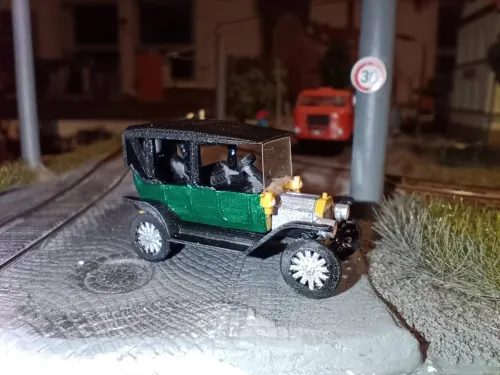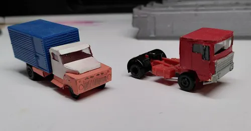 Na wenn wir jetzt schon die Frühwerke zeigen: Da das Angebot an Straßenfahrzeugen vor der Wende ziemlich spärlich war, habe ich mit farbigem Bastelkarton nachgeholfen, beim rechten anschließend noch Nitrofarbe drübergepinselt. Der linke basiert auf dem W50-Koffer, "Vorbild" war der GAS 53, der rechte hat kein konkretes Vorbild, dafür den Kühlergrill vom Tatra und das Fahrwerk vom MAN und tatsächlich ein Stück schwarzes Garn aus dem Nähkästchen meiner Mutter als Steg für das Ausstellfenster. Die klare Folie war aus dem Sichtfenster einer Süßigkeit aus dem Westen, das wurde als Bastelmaterial gehütet und sparsam eingesetzt.