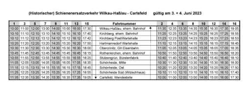 Am 03. und 04.06.2023 findet entlang der ehemaligen Schmalspurlinie von Wilkau-Hasslau nach Carlsfeld ein Fest auf Grund des 50 jährigen Wechsels des Verkehrsträgers von Schmalspur auf Bus statt.