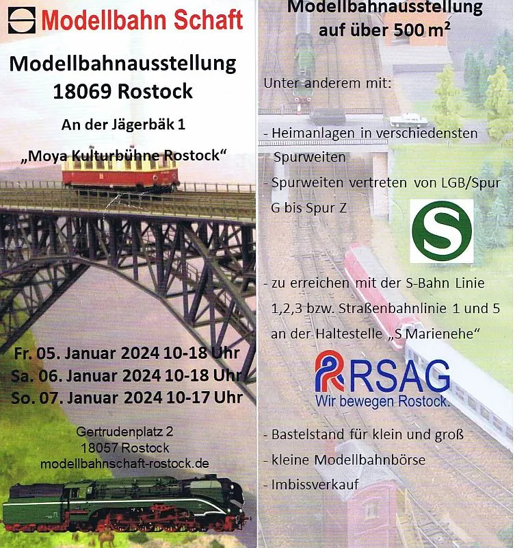 da ich es erst jetzt erfahren habe... eine Modellbahnausstellung für Kurzentschlossene vom 05. bis 07. Januar 2024 in Rostock-Marienehe. Geöffnet ist jeweils ab 10.00 Uhr.