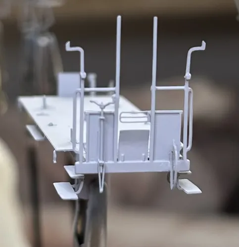 Einige Leitungen und Rohre am Wagenkasten wurden angebracht sowie die Schlussscheibenhalter von der Digitalzentrale am Wagenkasten und an der Bühne angelötet. Eine Bremskurbel aus gleichem Haus fand ebenfalls noch Platz.