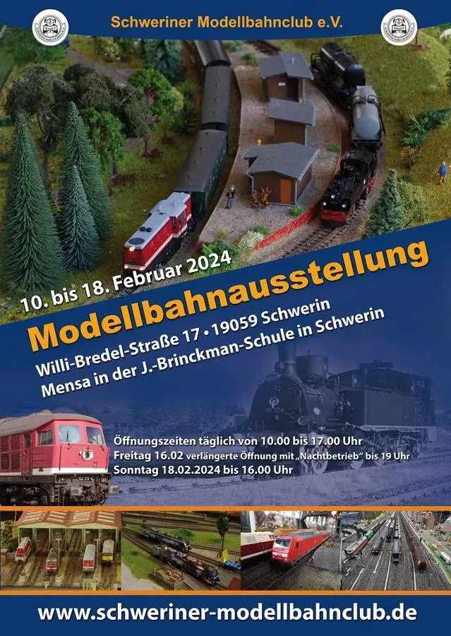 und die nächste Modellbahnausstellung vom 10. Februar - 18. Februar 2024 in Schwerin. Geöffnet ist jeweils ab 10.00 Uhr.