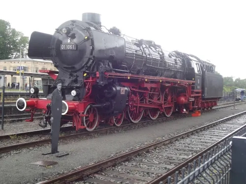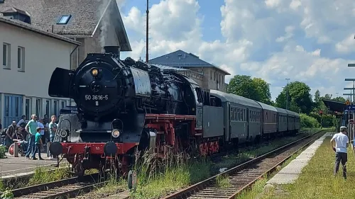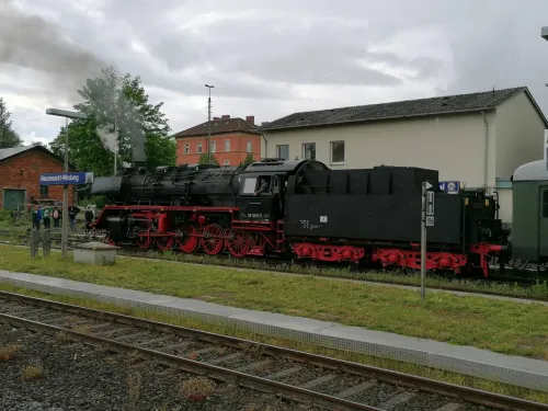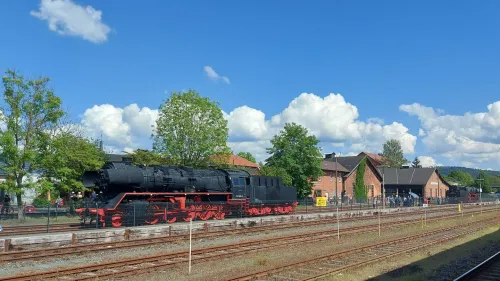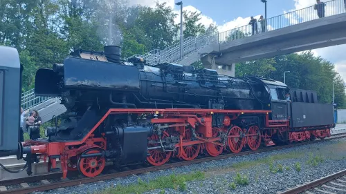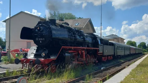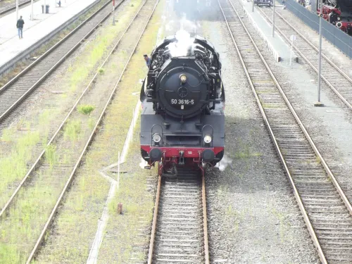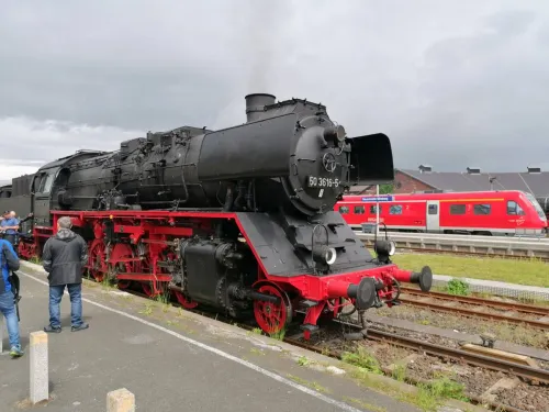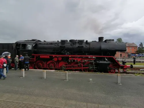 Von der Schwarzenberger 50 3616 wurde der Sonderzug nach Marktschorgast gezogen, die 01 1104 stand angeheizt auf dem Gelände.