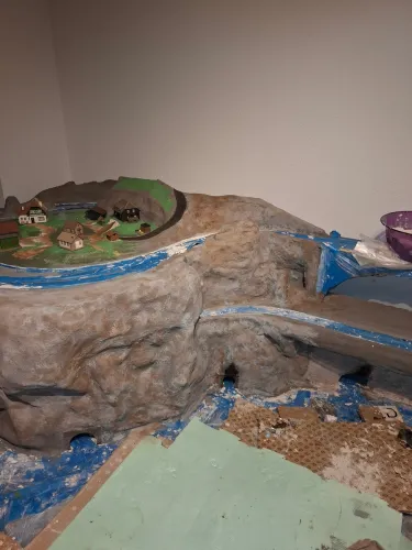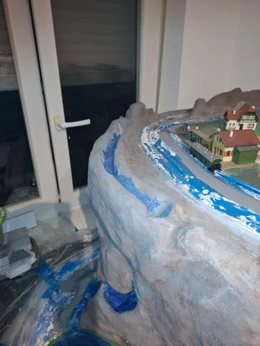 Im Moment, November 2025, sind die Gleise unten abgedeckt, da erstmal die Grungestalltung, Farbe an den Wendeln kommt.