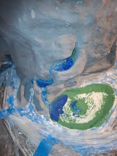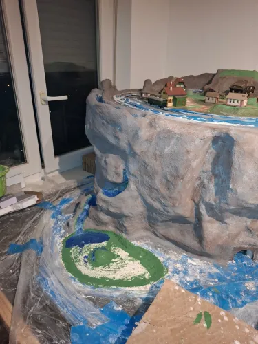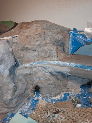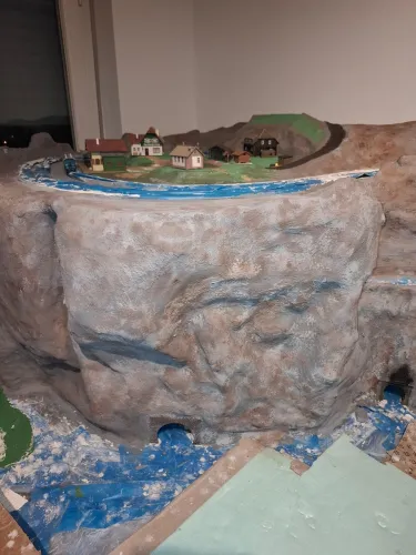 Das Viadukt ist aus WEDI Platten gebaut, und mit gut über 2000 Steinen beklebt worden, anschließend alles mit normaler Fugenmasse für Fliesen verfugt.