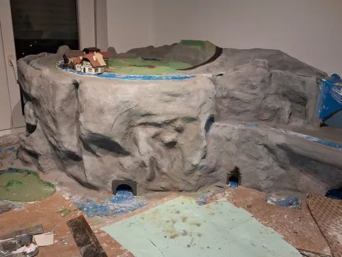 Das Viadukt ist aus WEDI Platten gebaut, und mit gut über 2000 Steinen beklebt worden, anschließend alles mit normaler Fugenmasse für Fliesen verfugt.