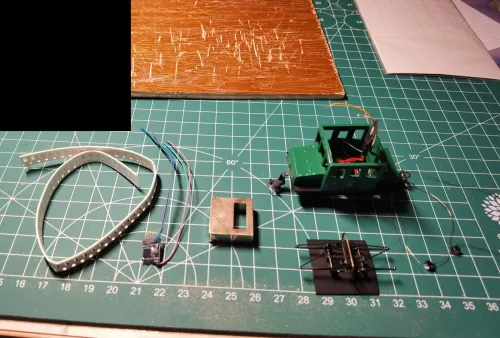 Zum letzten Stand hinzugekommen sind ein ESU-Lokpilot 5 micro, zwei Scheinwerfer und ein Messinggewicht, was ich bei Shapeways drucken lassen habe.