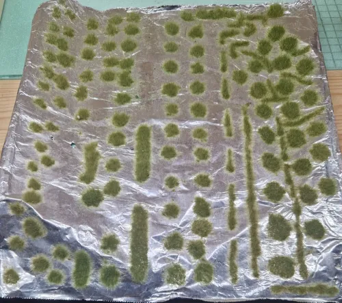 Die Alufolie mit der blanken Seite nach oben über das Brettchen legen und fixieren. Dann mit dem Kleber ein paar Punkte setzen, mal kleinere, mal größere und/oder ein paar unterschiedliche schmale Strecken (hier auch mal um die Ecke). Die Alufolie an die Klemme des Grasmaster und nun mit dem kleinsten Flock grob darüber gehen (nicht zu dicht machen, das Ganze). Brettchen umdrehen und leicht abklopfen, keine Angst die richtig eingeschossenen bleiben im Kleber, der Rest kommt wider ins Gefäß Auch das Flock kostet schließlich nicht wenig.