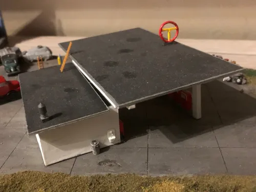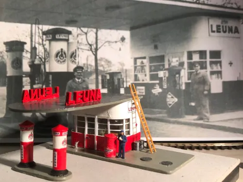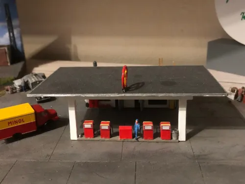 Bild zeigt fertige Tanke, weder Fahrzeug noch Figur noch Tankstellenschild auf dem Dach sind Bestandteil des Bausatzes!