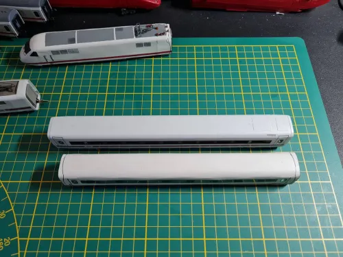 Testphase, Gehäuse hätten gepasst. für die Wagen muss ich die Chassis der Wagen wieder einkürzen, darin hab ich ja inzwischen Übung.