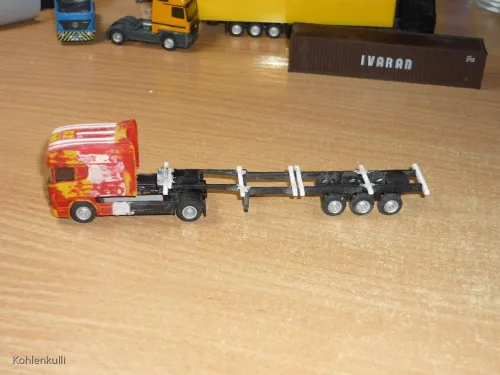 Da ein 40 Fuß Container von PSK und zwei 20 Fuß Container von Tillig von der Länge nicht richtig zusammenpassen, kann bei diesen Auflieger der 20 Fuß Container nur in der Mitte plaziert werden, was durchaus oft vorkommt.