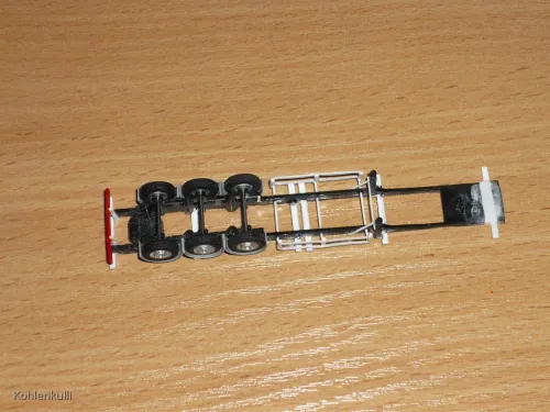Das Fahrwerk ist aus einen gekürzten SES-Teil, das ich bei der Hinterachse zusätzlich den Gegebenheiten (abgekanteten Kotflügel) angepasst habe.