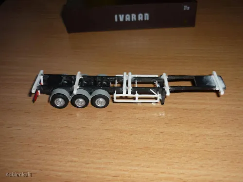 für den Auflieger mußte ein Herpa-Unterteil herhalten, bei dem bis auf den Rahmen alles ausgefräst wurde. die Traversen für die Container sind aus Evergreen-Profilen, die Kotflügel aus vorgebogenen 0,3mm Platten und auch für den Rest sind verschiedene Evergreen Profile verarbeitet worden.