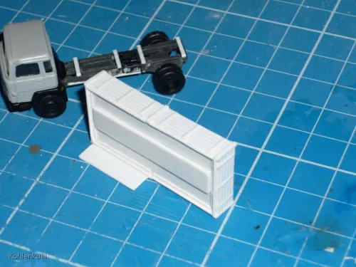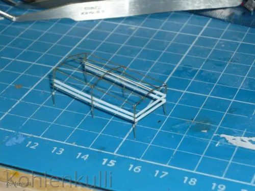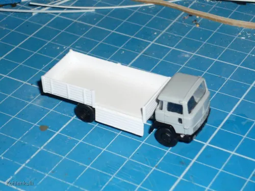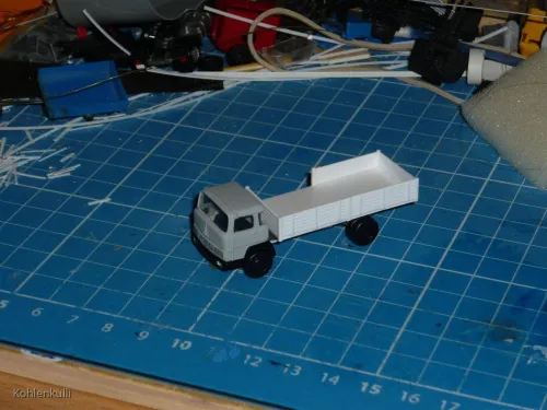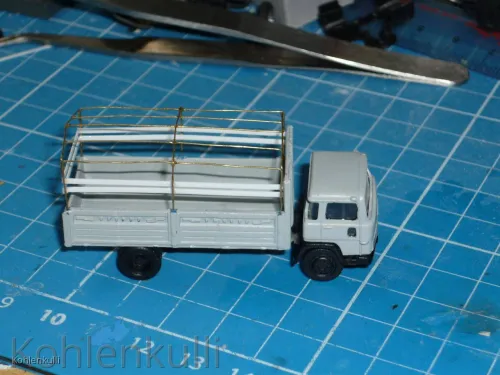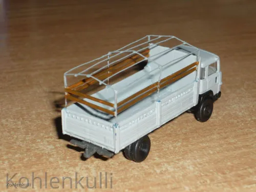 Die Pritsche ist vom RK-MAN und jeweils in der Länge und Breite gekürzt. Da mir die RK-Plane zu wuchtig dafür erschien, kan ich auf die Idee, selber eine zu bauen, und damit fingen die Probleme an. Der Spriegel ist aus 0,3 mm Draht zusammengeklebt und 2 x 0,4 mm PVC-Streifen bilden die Bretter nach. Die Plane ist aus einer Lage Tempo, welche mit Holzleim eingestrichen wurde.