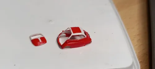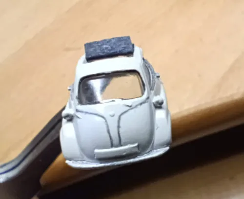 Eine andere Idee hatte ich erst vor kurzen, das Faltdach der Isetta mal zu öffnen..., hier ist der originale Scheibeneinsatz von Herrn Gabor drin. Die Zierlinien an der Tür sind mit dem Pinsel gezogen....
