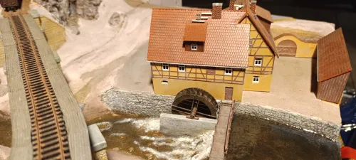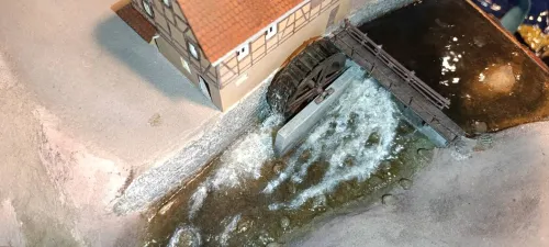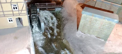 Das sieht sehr gut aus. Allein zum technischen Ablauf habe ich Fragen. Das Mühlrad ist sehr groß, aber dennoch stimmig für ein unterschlächtiges Wasserrad, denn die sind häufig recht groß. Beim Wehr sieht es aber so aus, als ob das Wasser über eine abgesenkte Sperre läuft. So werden solche beweglichen Schütze aber nicht gebaut. Ein Schütz wird nicht abgesenkt sondern angehoben. Das Wasser läuft dann nicht über den Schütz sondern darunter durch. Absenkbare Schütze sind zwar theoretisch denkbar, würden aber real sofort verschmutzen und mit Geröll zugesetzt werden, weshalb man sie immer so konstruiert, dass sie angehoben werden und das Wasser darunter durch fließt.
