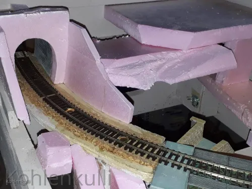 Mauerwerk und Portale aus Gips ritzen ist verdammt schwer, in Styrodur nur ungleich leichter. Was wirklich gute Ergebnisse erzielt ist das gießen aus Formen, da gibt richtig schnuckelige Tunnelportaleformen und Mauerwerk was man dann individuel "brechen" kann und es so deinen Gelände anpassen kann. Mach weiter so ralf