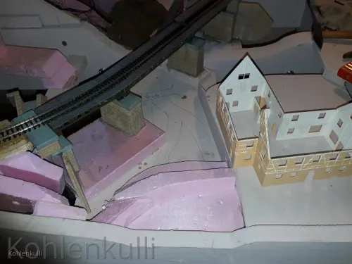 Von den ersten Gedanken, Portal und Stützmauer aus Gips zu ritzen bin ich mittlerweile angekommen und mache nun alles aus den schönen rosa Styrodur.
