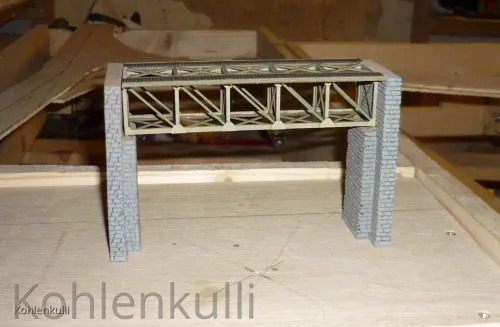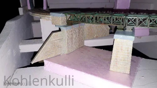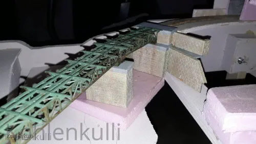 , das Wasser habe ich seine Zeit mit dem MBZ Wasser gemacht, welches sich bekanntlich verflüssig, wenn es erhitzt wird, und da ich an der Modulkante keinen Abschluß für den Bach habe, wollte sich das Zeugs einfach "dünne" machen. Mit leichten und trotzdem energischen Druck hat es sich wieder zurückschieben lassen, der Versiegler der bei diesen Wasser dabei ist, hat alles unbeschadet überstanden und hat jede Bewegung mit gemacht.