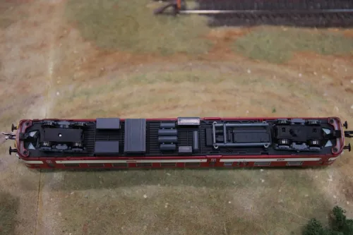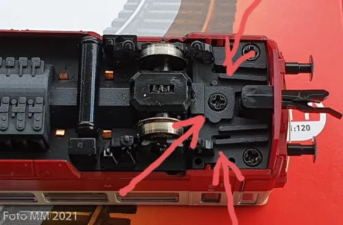 Mein erster Kritikpunkt sind bei meinem Modell feste und schief stehende Kupplungen. Das lässt sich aber beheben. Eine schiefe Kurzkupplung ist bei der Montage aus ihrer Führung gerutscht und klemmt nun zwischen Bodenplatte und dem darüber liegenden Gewicht.