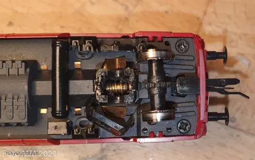 Die Achsgetriebe sind von unten zugänglich durch aufgerastete Deckel. Achslagerblenden abziehen, dann lässt sich der Achsgetriebedeckel ausrasten. Die Achse lässt sich entnehmen und man kann bei Bedarf die Schleifer nachbiegen.