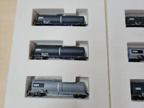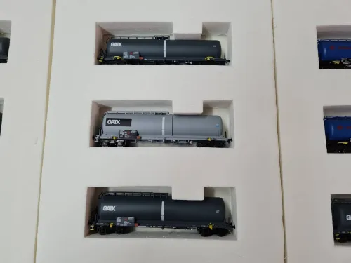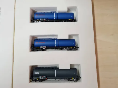 2 Sets sind Original, das 3. Set ist leider gemischt und dort wurden beim GATX Wagen Gewichte untergeklebt