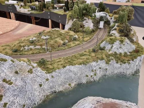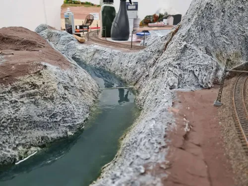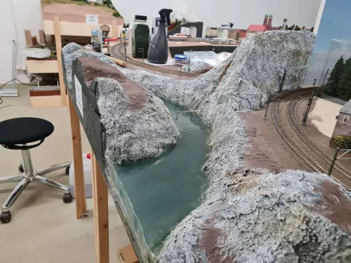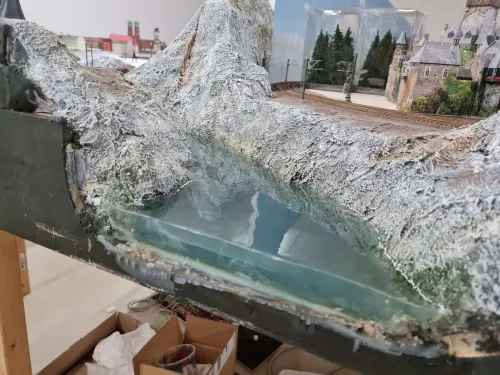 nachdem das Nochwasser nach 3 Wochen einen Nebel gebildet hate habe das ganze nun mit 2 Komponenten epoxidharz gegossen (kein spezielles Modellbahnmaterial, aber mit Woodland Farbpartikeln eingefärbt). Der Fluss ist an der Kante getrennt, was jetzt noch fehlt sind die Effekte auf dem Wasser, folgen aber demnächst.