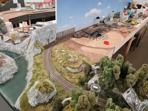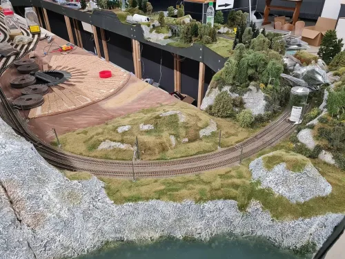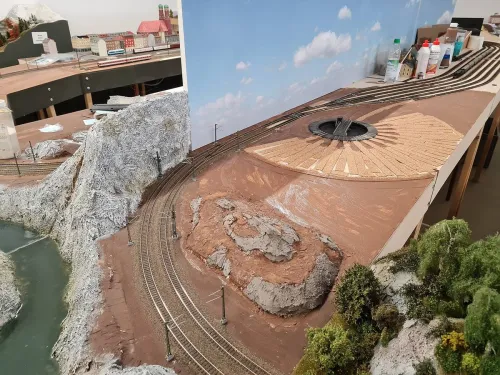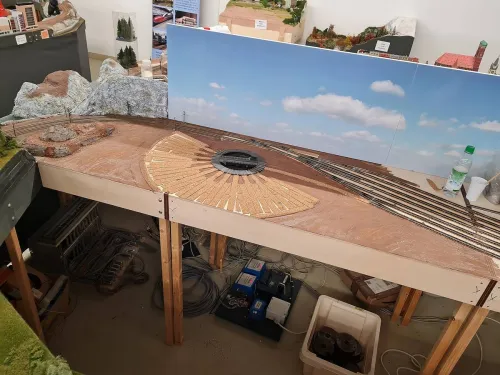 zuerst einen aktuellen stand an dem Modul der Yardeinfahrt. Der Hügel steht und auch die Felspartien sind gespachtelt, Grundfarbe wurde auch schon aufgetragen. Morgen werden die Felsen graniert und dann wird es da noch grün. Der Untergrund für den Ringlokschuppen ist vorbereitet, der Bausatz ist schon farblich anders gestaltet muss aber noch zusammen gebaut werden, danach kommen auch die restlichen Gleise im Bw (vorher will ich gucken wie sich das Lokschuppengebäude breit macht und wie es dann am besten ausschaut).