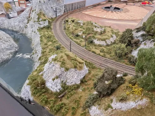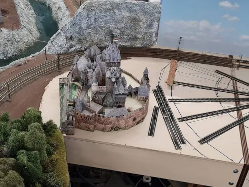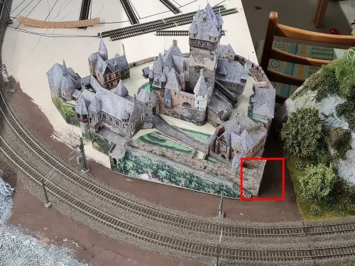 Der Eingang liegt im roten Viereck wenn sie so hinkommen soll wie sie gerade steht - endet also im nichts und dort einen Weg bauen ist jetzt nicht so plausibel wegen der Größen. Drehe ich die Festung bin ich viel zu nah am Ringlokschuppen vom Bw, das macht den Baugrößenunterschied wieder zu sehr sichtbar. Jetzt überlege ich diese wegzulassen (um 180° drehen geht auch nicht dann ist der Zugang direkt an den Gleisen zum Hintergrund liegend). Was meinst ihr?