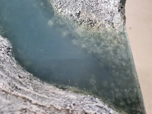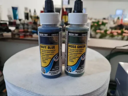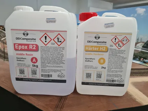 V180-Oli nun zu dem Wasser, dafür habe ich folgendes zwei-Komponenten Epoxid Harz mit Härter genommen, Mischung 100/40 (also bei mir 500gr Resin und 200gr Härter). Vorm vermengen habe ich auf die 700gr Masse 5-6 Tropfen von den hochpigmentierten Farben von Woodland hineingegeben (siehe Bild) und das dann min. 3 Minuten verrührt (vorsichtig damit sich keine Blasen bilden). Wie zu sehen kann man das bis zu 5cm Gießhöhe nutzen daher habe ich zwei Schichten damit gegossen. Jetzt muss ich nur noch sehen mit was ich die begradigten Kanten "polieren"kann.