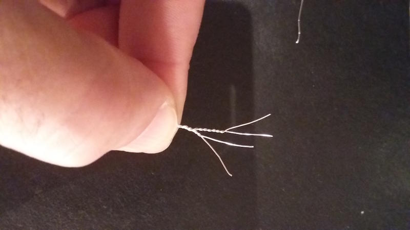 2) wieder zwei Drähte Zusammendrillen und etwas versetzt nach unten mit dem vorherigen Drahtpaar Zusammendrillen